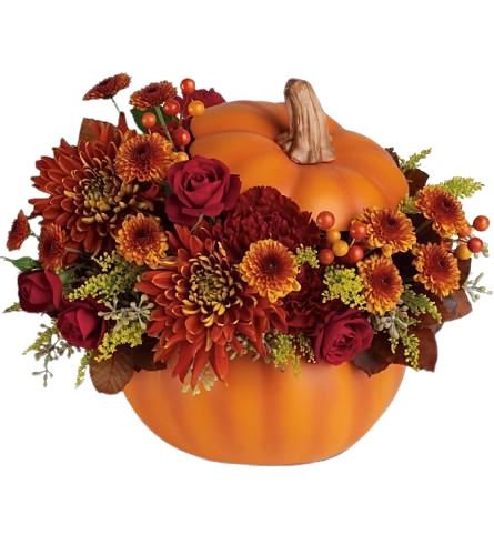 - Natural Orange Pumpkin: which adds a whimsical and seasonal touch. Its rich orange hue complements the flowers beautifully. Pumpkins are iconic symbols of autumn, representing harvest and abundance, making them a perfect addition to this arrangement.