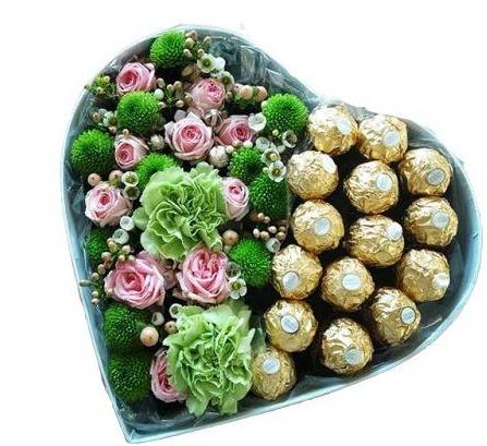 Stunning composition of fresh cut flowers and chocolate in elegant box.