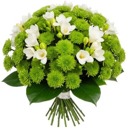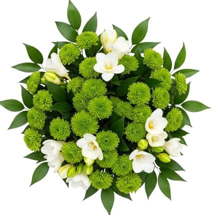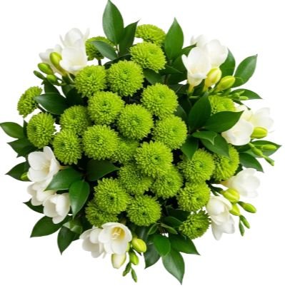 Brighten someone’s day with our elegant Green Santini Chrysanthemum and White Freesia Bouquet. Perfect for St. Patrick's Day, thank-you gestures, or simply to show you care, this fresh and vibrant arrangement combines timeless beauty with natural charm. Celebrate simplicity and elegance with the Green Santini Chrysanthemum and Freesias Bouquet — a fresh and beautiful floral arrangement for any occasion.