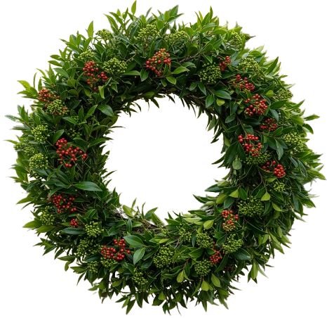 - Green Skimmia: the rich, glossy green foliage of skimmia forms the perfect base for the wreath, symbolizing renewal, harmony, and everlasting life. Its dense texture adds fullness and depth, creating a luxurious, garden-fresh look.