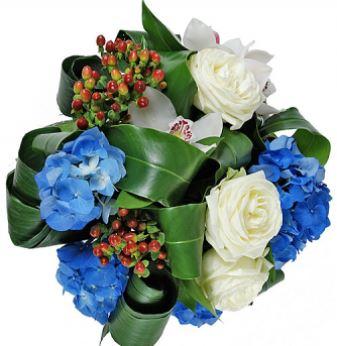 Whether it's for a sophisticated event, a heartfelt gift, or an exquisite home centerpiece, this bouquet exudes refinement and charm. The combination of blue hydrangeas, white roses, red hypericum, white cymbidium orchids flowers, and lush greenery creates a harmonious and eye-catching arrangement. The Harlequin Bouquet is a beautiful expression of style and grace, making it an unforgettable addition to any setting.