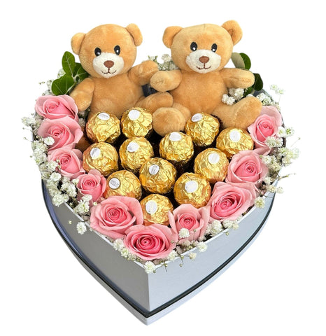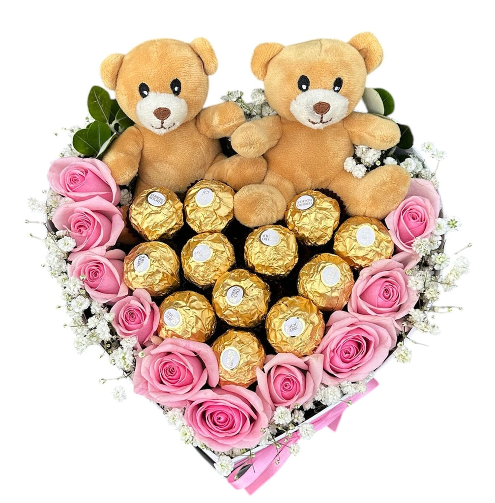 Stunning composition of fresh cut roses and chocolates in elegant box.