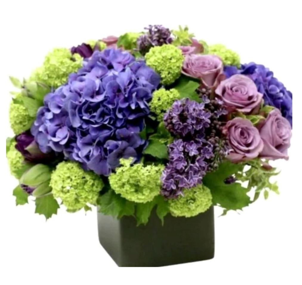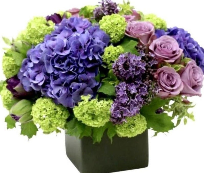 Discover the exquisite Hydrangea and Lilac Luxury Box, a stunning arrangement featuring purple hydrangea, purple lilac flowers, lavender roses, purple tulips, green viburnum, and lush greenery. Perfect as a gift for him or her, this elegant flower box brings sophistication and charm to any occasion.