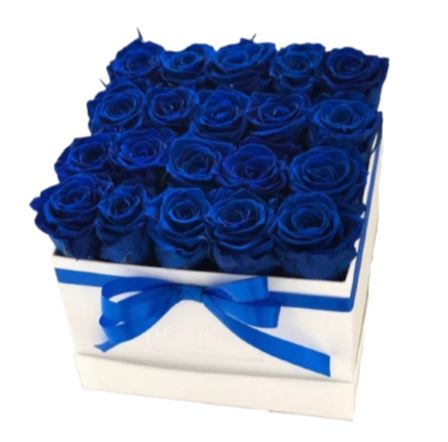 The box contains 9 carefully arranged preserving roses DARK BLUE with a rose head diameter of 3.5 cm.