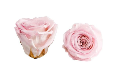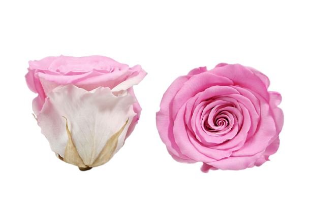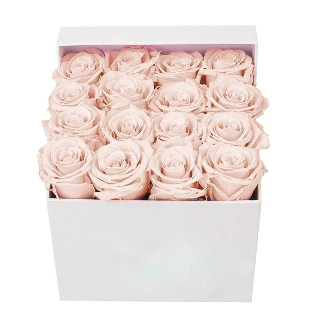 The box contains 16 carefully arranged PINK POWDER preserve roses with rose head diameter Ø 5 cm.