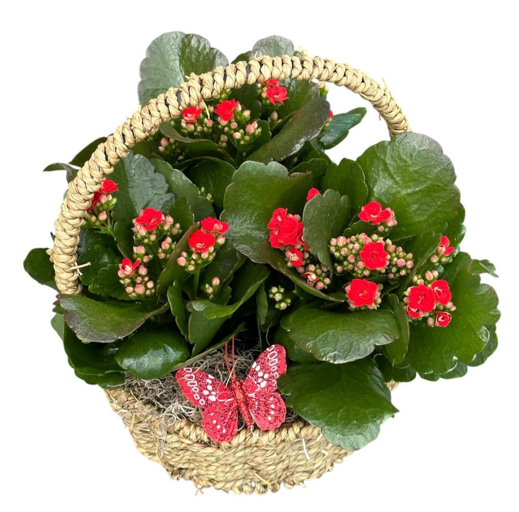 Bring colour and natural charm into any space with this beautiful Kalanchoe plant arrangement, carefully styled in a round wicker basket with a handle. Known for its bright, cheerful flowers and easy care, Kalanchoe is the perfect gift for any occasion or a lovely addition to your own home.