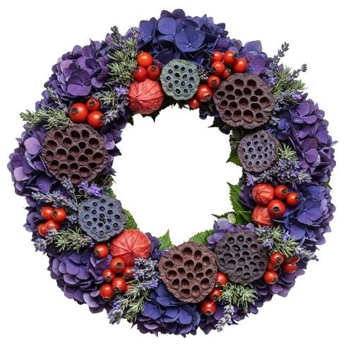 - Lotus Seeds Pod (Physalis): eye-catching and playful, these lantern-like blooms infuse the wreath with autumnal warmth and festive cheer.
