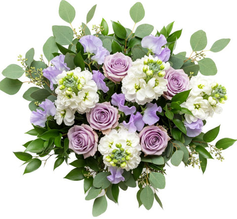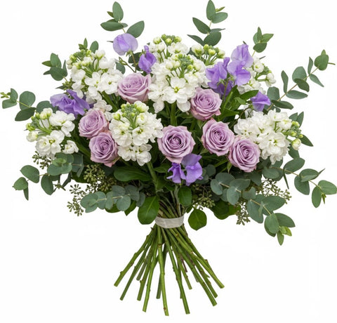 Introducing the Lavender Roses with Stock and Sweet Pea Bouquet, a graceful floral arrangement blending soothing lavender tones with fresh greenery for a timeless, romantic feel. This bouquet is thoughtfully designed to convey elegance, calm, and refined beauty. Perfect for birthdays, surprise gift, weddings, or as an elegant gesture of appreciation, the Lavender Roses with Stock and Sweet Pea Bouquet captures a sense of peaceful luxury and natural beauty.