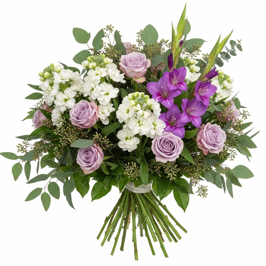Lavender Roses with Stocks and Gladioli Bouquet: Elegant Florals in Soft Lavender and White