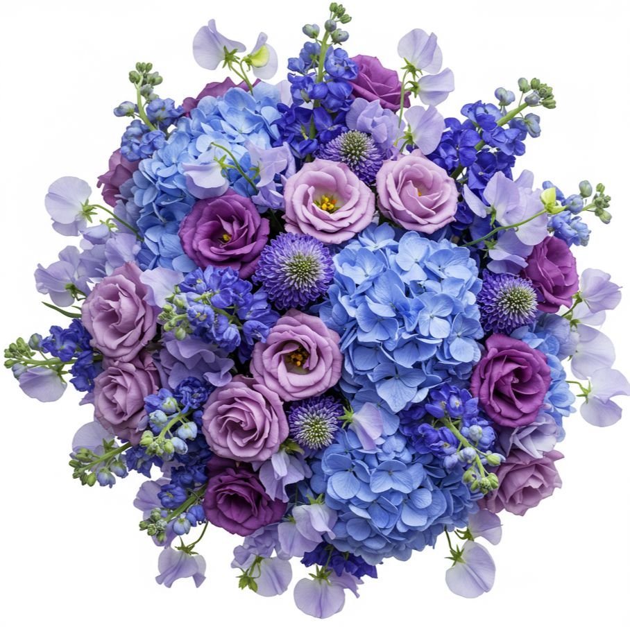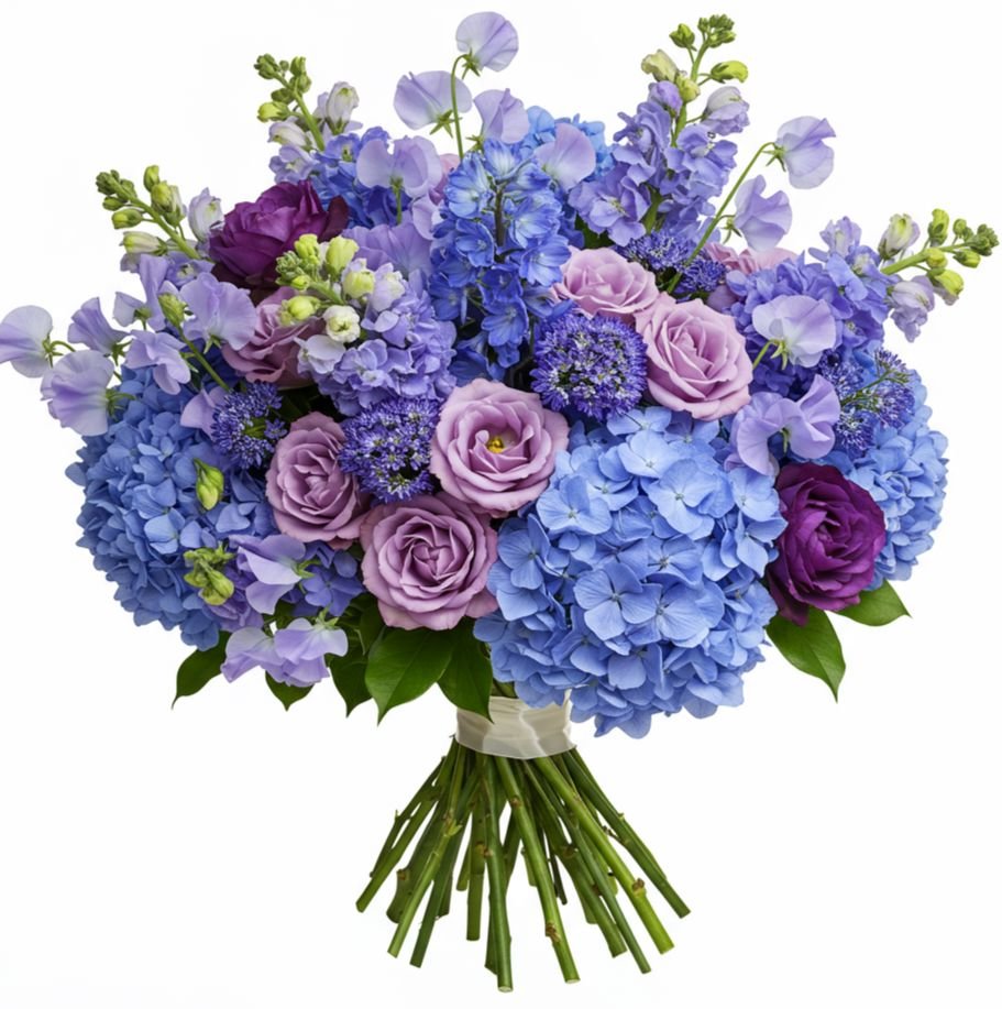 - Blue Hydrangea: are known for their large, globe-like clusters of small flowers. Blue hydrangeas symbolize understanding, patience, and heartfelt emotions. They add a lush, voluminous, and textural element to the bouquet, creating a visually stunning base with their soft blue hues.