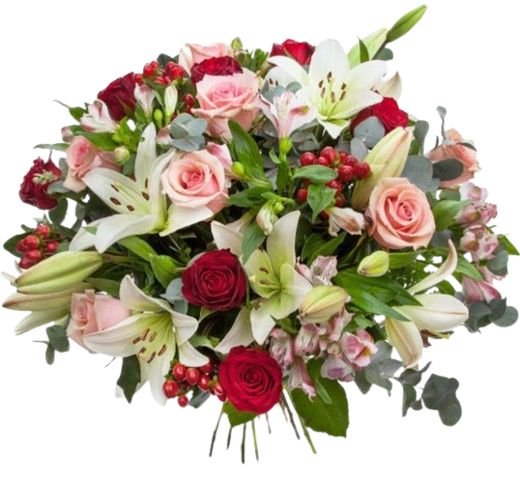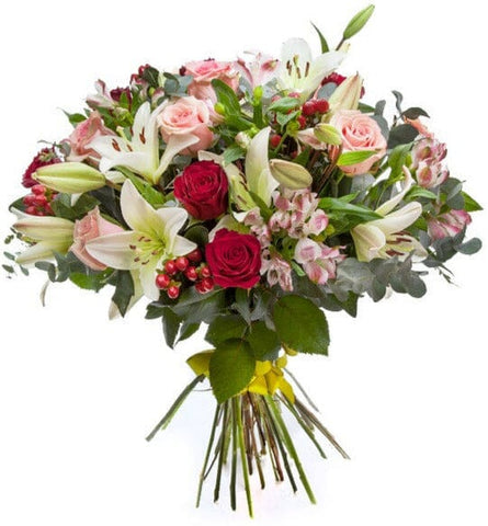The Lily and Blushed Roses Bouquet is a stunning and romantic floral arrangement that beautifully combines classic elegance with soft, warm tones. Featuring pure white lilies alongside red and pink roses, complemented by delicate pink alstroemeria blooms and vibrant red hypericum berries, this bouquet is enriched with fresh eucalyptus for texture and fragrance. It’s perfect for expressing love, celebration, or simply brightening someone’s day with a touch of sophistication. The Lily and Blushed Roses Bouquet is a beautifully balanced arrangement, combining classic blooms with soft accents — ideal for romantic gestures, celebrations, or thoughtful gifts.