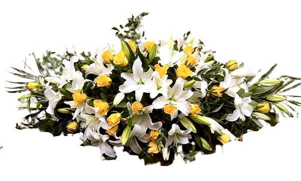 The composition for the coffin with lilies and rose petals is a very traditional but at the same time amazing arrangement of a coffin. This coffin tribute will be perfect to convey your deep love and eternal commitment. It can be said that this composition is the perfect tribute to a loved one.