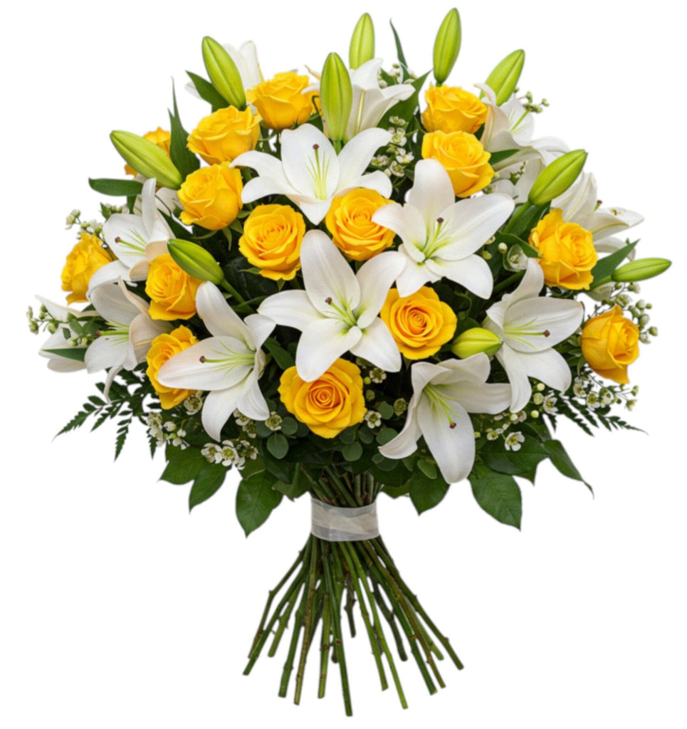 Celebrate joy and elegance with our Lily & Yellow Roses Luxury Bouquet, a sophisticated arrangement that combines the pure beauty of white lilies with the sunny cheerfulness of yellow roses. Carefully selected blooms arranged to ensure long-lasting beauty and freshness. Ideal for birthdays, congratulations, thank you gifts, or simply to brighten someone’s day.