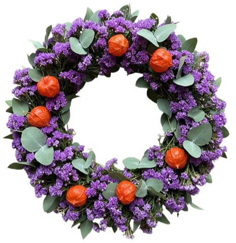 The Limonium and Physalis Door Wreath is a vibrant and textured seasonal decoration that perfectly blends natural beauty with a touch of rustic charm. The Limonium and Physalis Door Wreath is a charming and seasonal piece that captures the essence of autumn with its warm hues and natural textures. Perfect for doors, entryways, or interior walls, it adds a welcoming, festive touch to your home. The combination of colorful blooms, vibrant orange lanterns, and lush greenery creates a balanced and eye-catching design that celebrates nature’s beauty in every detail.