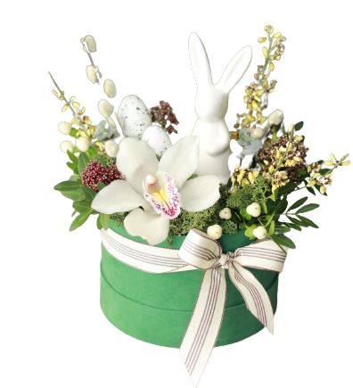 You love flowers, but you don't want a huge bouquet to take up all the space on the table? We have created a solution that you will surely like. A box with flowers and decorations is a great way to combine both. This arrangement is also a perfect way to send someone Easter wishes.
