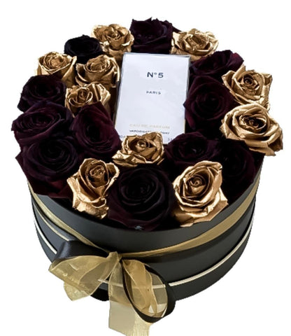 Featuring premium black roses and gold roses, paired with an exclusive perfume of your choice, this luxurious arrangement is a masterpiece crafted by our expert florists. The beautifully scented flowers and high-end perfume create a truly delightful combination, making it an ideal gift for Valentine's Day, anniversaries, birthdays, or any special occasion.
