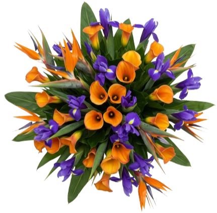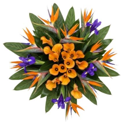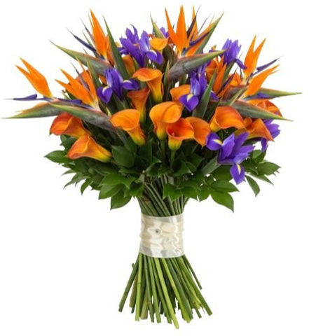 The Luxury Bouquet of Strelitzia and Calla Lily with Blue Iris is a bold and exotic arrangement designed to impress. Combining the dramatic Birds of Paradise (Strelitzia Reginae), vibrant orange calla lilies, striking blue irises, and lush greenery, this bouquet is a masterpiece of color, elegance, and sophistication. Perfect for special occasions or as a luxurious gift, it brings a touch of the extraordinary to any setting. Perfect for anniversaries, celebrations, or as an unforgettable gift, this bouquet radiates sophistication and style.