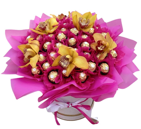 Indulge in the ultimate gift experience with our Luxury Box of Chocolates adorned with Cymbidium Orchids. This sophisticated arrangement pairs decadent chocolates with the timeless beauty of fresh cymbidium orchids, creating a truly memorable gift for any occasion.
