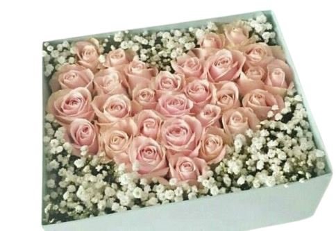 Housed in a beautifully crafted box, the roses are meticulously arranged in a heart shape, surrounded by the soft, cloud-like texture of gypsophila. Surrounding the roses is a halo of gypsophila, with its cloud-like clusters of tiny white blooms adding a touch of softness and sophistication. The delicate contrast between the bold roses and the gentle gypsophila creates a harmonious and elegant composition, elevating the arrangement to a work of art.