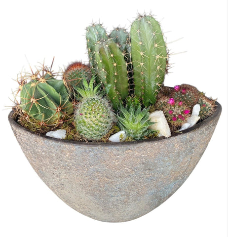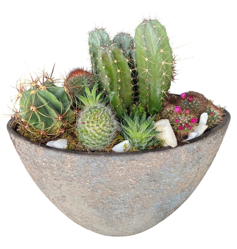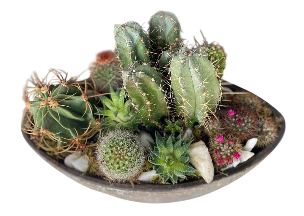 Each cactus is carefully selected for its individual character and aesthetic appeal, creating a harmonious and low-maintenance arrangement that thrives with minimal care. The neutral-toned ceramic oval pot complements any décor, making this piece a perfect addition to modern interiors or as a thoughtful gift for plant lovers.