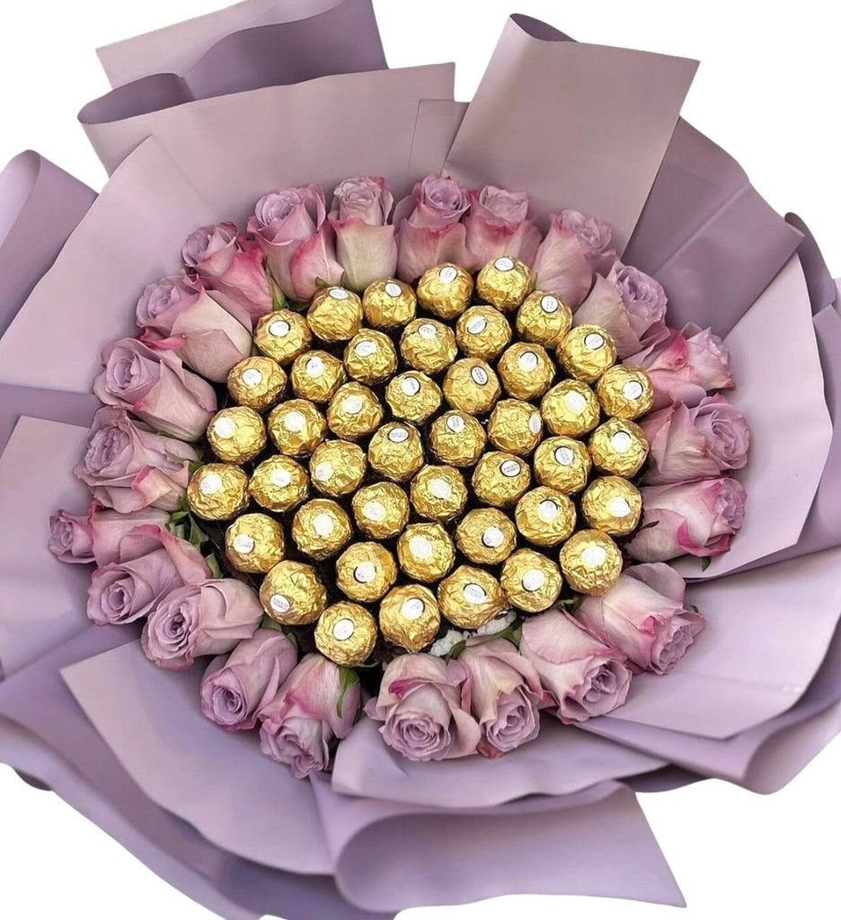 Perfect for special occasions, weddings, anniversaries, or as a lavish treat. Explore the ultimate fusion of decadent flavors and timeless beauty. Whether you're celebrating a special occasion or simply want to surprise someone with a sweet gesture, this luxurious bouquet is perfect for birthdays, anniversaries, or as a thoughtful "just because" gift. The combination of beautiful, hand-picked roses and rich, delectable chocolates is sure to delight and impress anyone who receives it.