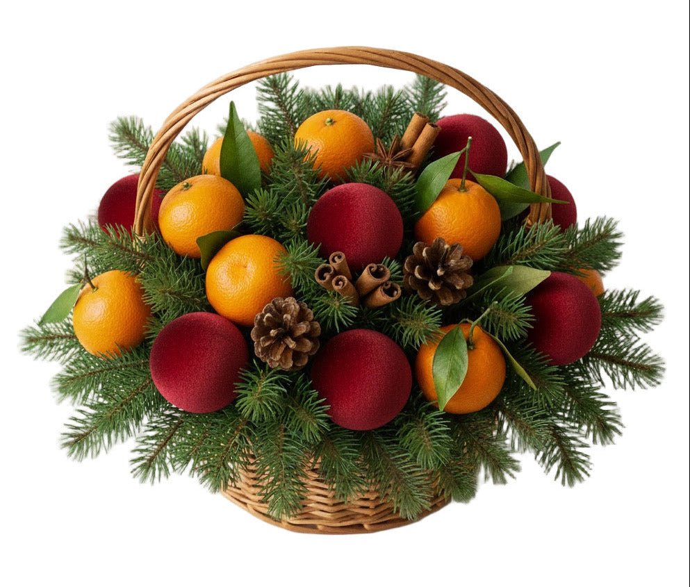 Bring warmth, colour, and festive fragrance into your home with our Luxury Christmas Basket, a beautifully curated holiday arrangement featuring fresh tangerines, rich red velvet baubles, aromatic cinnamon sticks, star anise, natural cones, and lush fresh spruce. Designed as an elegant Christmas table decoration or a luxurious seasonal gift, this handcrafted basket blends traditional holiday scents with modern, stylish décor elements. The combination of citrus, spices, and soft velvet creates a truly unique and sophisticated Christmas atmosphere.