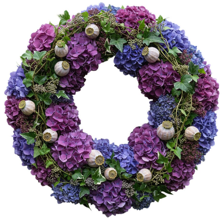 - Fresh Purple Hydrangea: these lush, voluminous blooms bring depth and elegance to the wreath. Their rich purple tones symbolize grace, beauty, and abundance, adding a luxurious touch to your doorway.