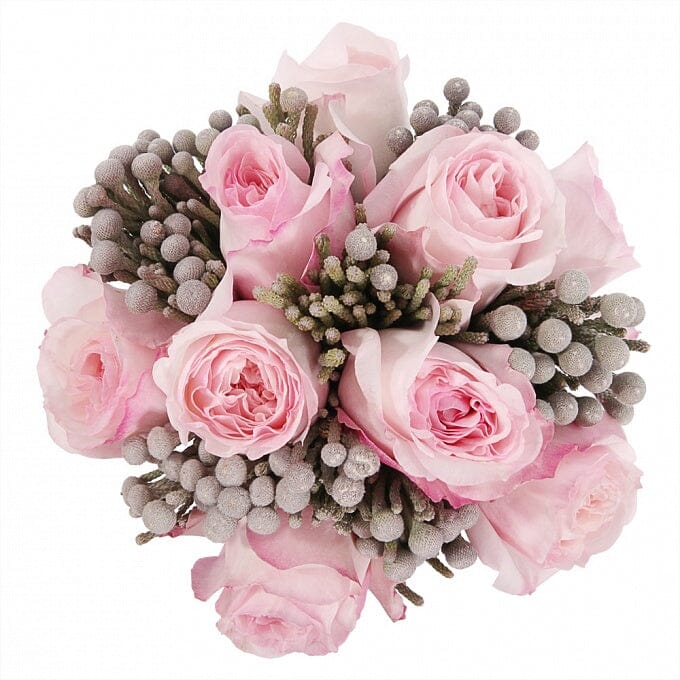 - Silver Kaaps Brunia: adding texture and depth, the silver-gray brunia balls contrast beautifully with the roses, creating a unique and sophisticated look. Their subtle metallic tone complements the soft pink roses perfectly.