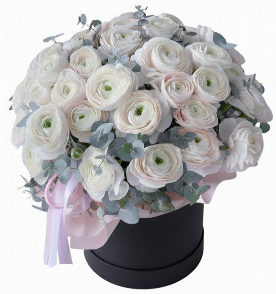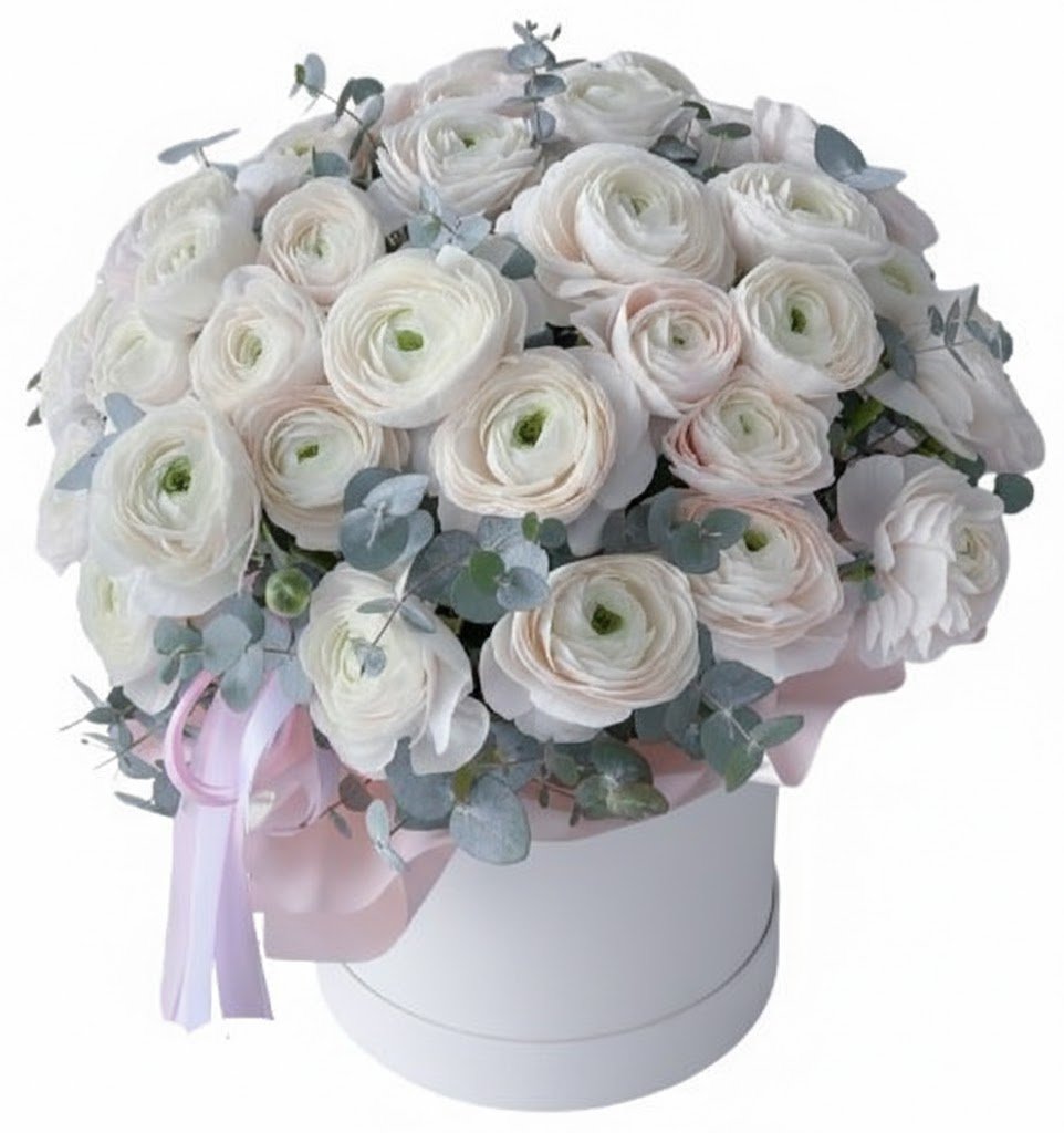 Luxury Pale Pink Ranunculus with Eucalyptus Box – Elegant and Timeless Floral Arrangement. Introducing the Luxury Pale Pink Ranunculus with Eucalyptus Box, a sophisticated and timeless floral arrangement that combines delicate beauty with a touch of nature. Indulge in the refined beauty of our Luxury Pale Pink Ranunculus with Eucalyptus Box. This exquisite floral arrangement combines the soft, delicate petals of pale pink ranunculus with the fresh, aromatic elegance of eucalyptus, creating a luxurious and timeless gift. Perfect for any occasion, from birthdays and anniversaries to Mother's Day and thank-you gestures, this bouquet exudes sophistication and charm.