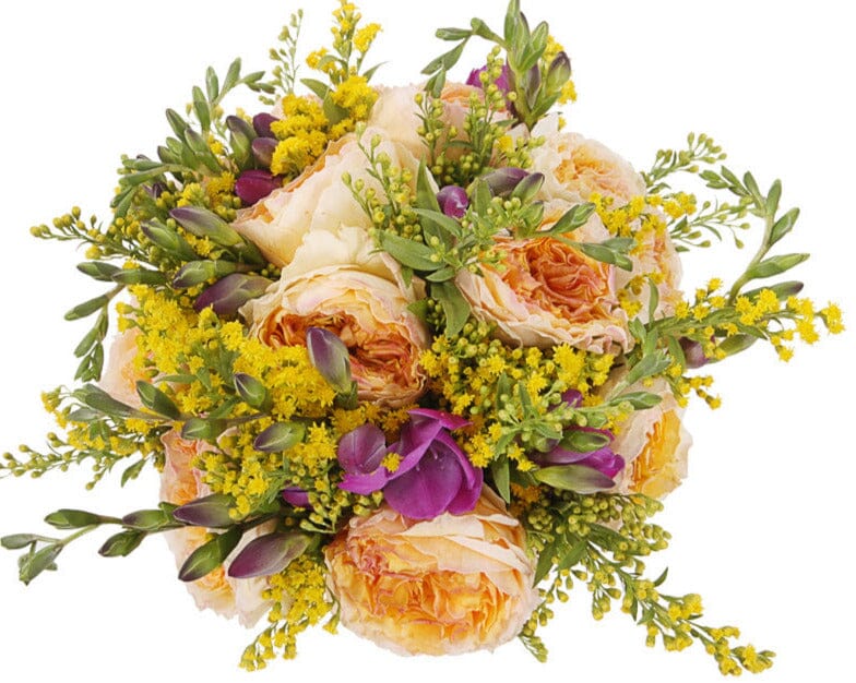 Experience elegance and charm with our Luxury Peach Garden Roses with Cerise Freesias Bouquet, a sophisticated floral arrangement from Flowers Box London. This luxurious bouquet features peach garden roses blooms, complemented by vibrant cerise freesias and sunny yellow solidago, creating a stunning combination of soft and cheerful tones. Perfect for anniversaries, birthdays, or special gestures of love, this bouquet radiates warmth, beauty, and refinement. Each bloom is carefully selected and artfully arranged to ensure a lasting impression.