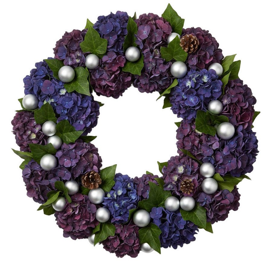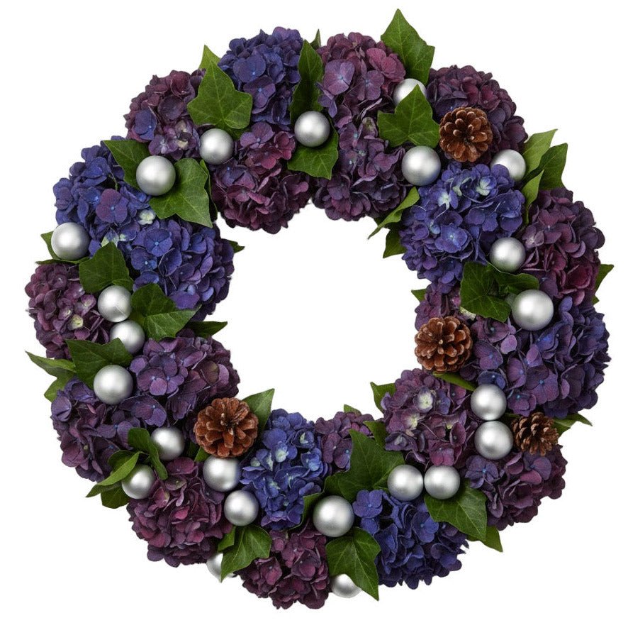Add a touch of elegance and sophistication to your seasonal décor with this Luxury Purple Hydrangea Wreath, beautifully accented with shimmering silver details and natural elements. This stunning arrangement blends lush florals with festive charm — perfect for doors, walls, or as a table centerpiece. Blending cool silver tones with the rich hues of hydrangea and fresh greenery, the Luxury Purple Hydrangea & Silver Baubles Wreath exudes timeless beauty — a statement piece for any festive setting.