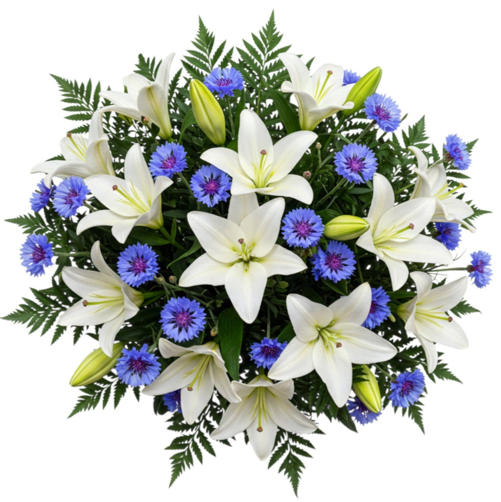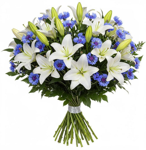 The white lily symbolizes purity, serenity, and renewal, while the blue cornflower adds a pop of color and meaning, often associated with hope and inspiration. Together, they create a striking contrast that’s both calming and uplifting. Whether you're expressing sympathy, celebrating a special occasion, or sending a gesture of appreciation, this bouquet delivers timeless beauty with a modern twist.