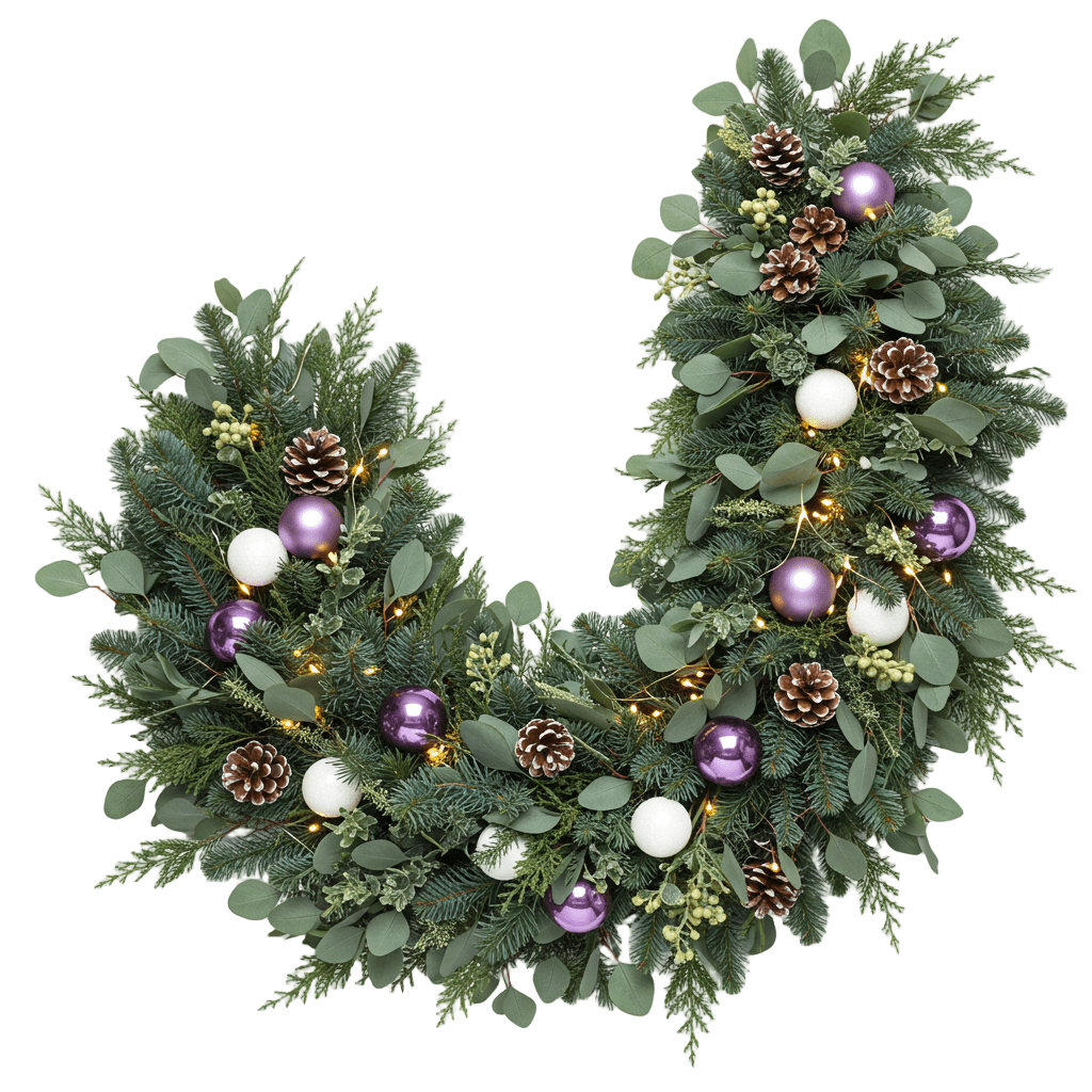 The Luxury Winter Garland in Purple & White is a breathtaking decoration that embodies the sophistication and magic of the winter season. Designed with meticulous attention to detail, this garland blends elegant hues, natural textures, and festive sparkle to create a truly show-stopping piece — perfect for mantels, staircases, doorways, or as a statement centerpiece for holiday gatherings. This luxurious garland features a stunning combination of purple and white baubles, which bring a regal and modern touch to the traditional winter color palette. The natural white cones add a frosted, woodland charm, while fresh spruce and fresh conifer branches infuse the arrangement with a lush, fragrant greenery that instantly evokes the scent and spirit of the holidays.