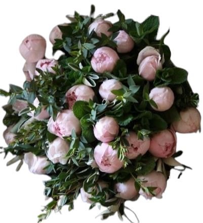 - Greenery: includes various types of foliage used to add volume, texture, and contrast to floral arrangements. Common choices include eucalyptus, fern, ruscus, and salal leaves. The greenery enhances the overall appearance of the bouquet by providing a lush, natural backdrop for the peonies and highlighting their vibrant colors.