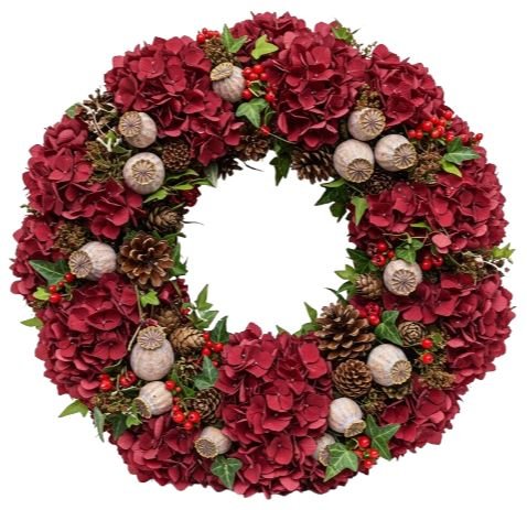 - Fresh Burgundy Hydrangea: the bold, velvety petals of the burgundy hydrangea create a dramatic focal point, adding depth and luxury to the wreath.