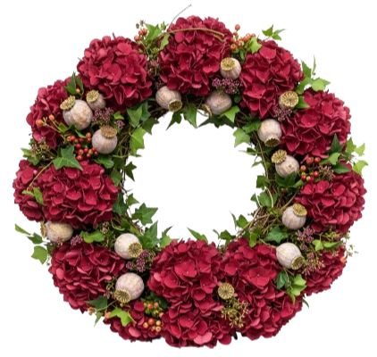 Bring warmth, texture, and timeless beauty to your home with our Marvelous Burgundy Hydrangea with Papaver Wreath. Expertly handcrafted, this wreath combines deep, rich tones and natural textures for a sophisticated seasonal display. Perfect for your front door, dining table, or mantel, it adds an elegant and inviting touch to any autumn or winter setting. Combines flowers, seedpods, and greenery for a beautifully balanced, natural look. Each wreath is carefully arranged using high-quality, long-lasting materials for a luxurious finish. A thoughtful and elegant gift for housewarmings, weddings, or seasonal celebrations.