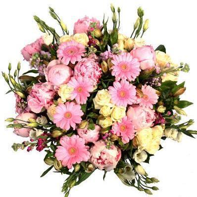 Capture the relaxed beauty of a summer meadow with our Meadow Flower Bouquet, an artfully arranged mix of soft colors and natural textures. This charming bouquet features lush pink peonies, cheerful pink gerbera flowers, delicate ivory spray roses, vibrant cerise stock flowers, elegant white lisianthus, and graceful pink alstroemeria, all complemented by fresh greenery.
