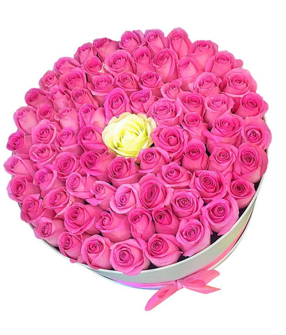 The Melting Mood Box is a delicate and meaningful floral arrangement where pink roses represent admiration and joy, while the single white rose in the center adds a unique touch of purity and sincerity. This beautifully balanced design creates a melting effect, symbolizing warmth, love, and emotional depth.