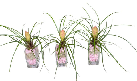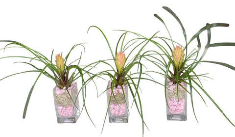 Low maintenance, eye-catching, and full of personality — the Mini Pink Tillandsia Trio is the perfect blend of style and simplicity. Delivered fully arranged and ready to enjoy — no mess, no fuss. Bring life, color, and charm into your home with the Mini Pink Tillandsia Trio in Glass Tank Pots. A modern, fuss-free way to enjoy plants every day.