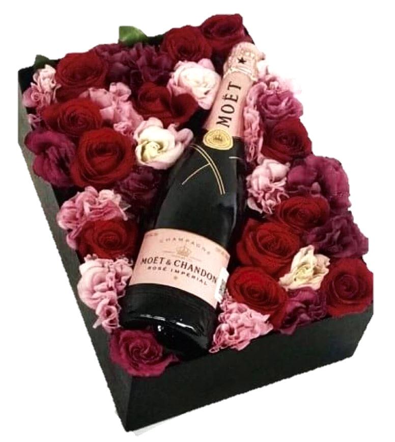 Discover the timeless elegance of the Moet in Blooms Gift Box, a luxurious gift designed to leave a lasting impression. Featuring a stunning arrangement of red roses, burgundy carnations, pink vintage carnations, and pink lisianthus flowers, this gift is a masterpiece of floral artistry. Paired with a bottle of Champagne Moet 0.75ml of your choice, this sophisticated gift box embodies style and sophistication.