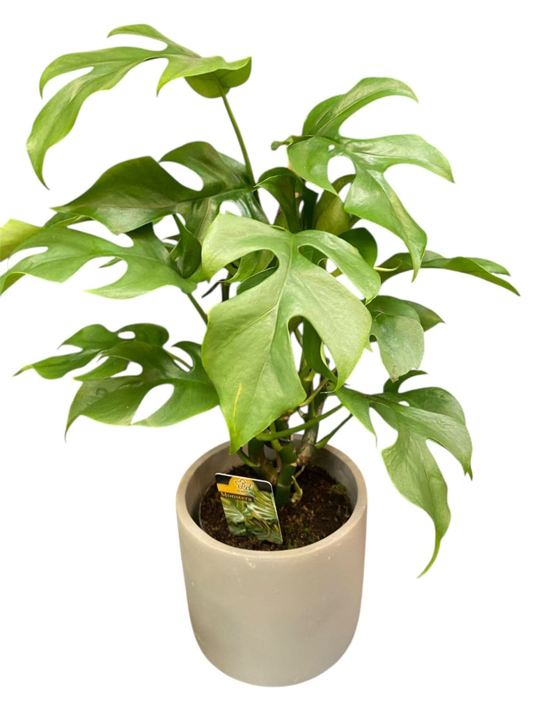 Monstera are evergreen climbing shrubs with aerial roots, and usually ovate leaves which are often pinnately cut or lobed; arum-like flowerheads with white spathes arise from the leaf axils on mature plants. This plant is great both indoors, but can also be grown outdoors in humus-rich, moist but well-drained soil, in partial shade, in a sheltered, frost-free place. They grow under glass in clay-based compost in bright, indirect light with moderate to high humidity.