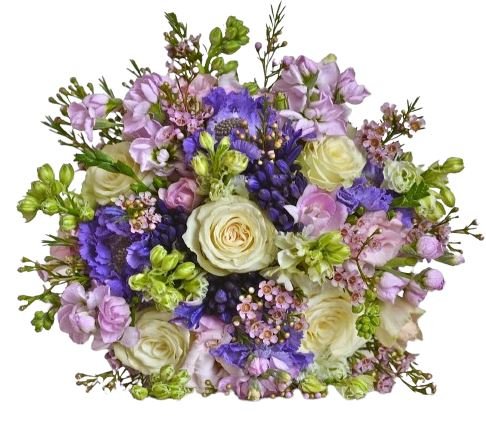 The Morning Dew Bouquet is a delicate and refreshing floral arrangement that captures the essence of a serene morning, with soft colors and a gentle, natural beauty. The Morning Dew Bouquet is a beautifully balanced arrangement, combining the elegance of white roses with the soft hues of pink stock, blue scabiosa, blue agapanthus, and pink wax flowers. This bouquet evokes the freshness and tranquility of a morning garden, making it a perfect choice for Mother's Days , new baby, or any occasion where you want to convey a sense of peace, love, and new beginnings.