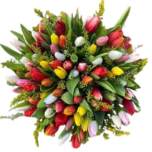 Whether you're celebrating a special occasion or simply want to brighten someone's day, this vibrant arrangement is sure to make a lasting impression. Add a burst of color to your day with our Multicolored Tulips with Solidago Bouquet. Featuring a lively mix of tulips and solidago, this bouquet is perfect for spring celebrations, thank you gifts, or simply brightening up any space.