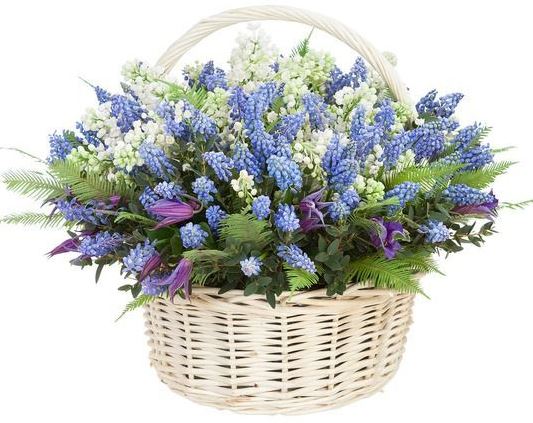 The Muscari with Convallaria Basket is a delightful floral arrangement that combines the delicate beauty of Lily of the Valley, the charming allure of blue muscari, and the vibrant hues of purple clematis.