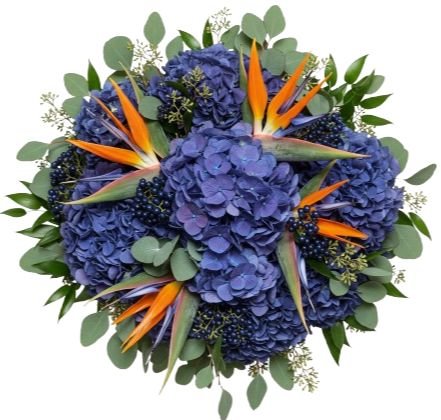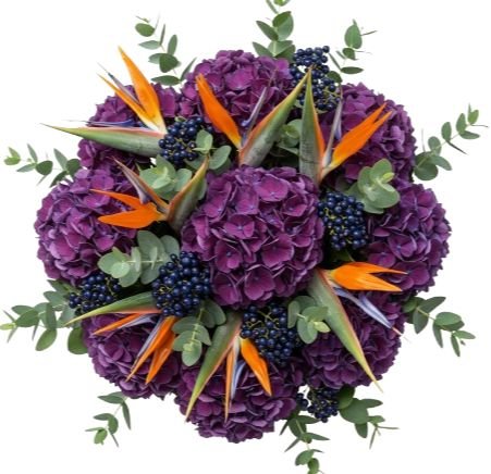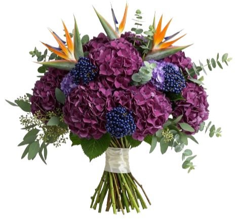 - Hydrangea (colour to choose from): rich, velvety purple hydrangeas represent gratitude and deep emotion, giving the bouquet a lush and regal presence.