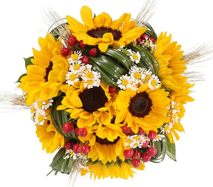Bring rustic charm and vibrant color into your home with our Natural Look Sunflowers and Daisy Tanacetum Bouquet. Featuring bright yellow sunflowers, delicate daisy tanacetum, red hypericum berries, dried natural wheat, and bear grass, this bouquet is thoughtfully designed to capture the effortless beauty of nature. The addition of dried natural wheat and bear grass adds texture and a natural countryside feel, making this arrangement ideal for those who love earthy, relaxed, and authentic floral designs.