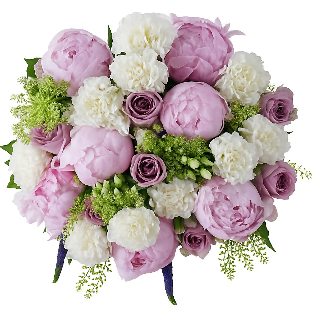 - White Carnations: adding a sense of purity and innocence, the White Carnations complement the pink peonies beautifully. Their pristine white petals provide a striking contrast against the other blooms, creating a sense of balance and harmony in the bouquet.