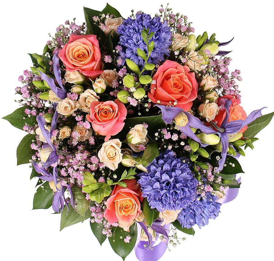 The Orange and Blue Fragrant Bouquet is a vibrant and aromatic arrangement that combines a delightful mix of colorful blooms and lush greenery. The blue hyacinth, peach spray roses, orange roses, white freesias, purple clematis, pink gypsophila, white alstroemeria, and assorted greenery form the Orange and Blue Fragrant Bouquet. This stunning arrangement is perfect for adding a burst of color, fragrance, and joy to any occasion or space.