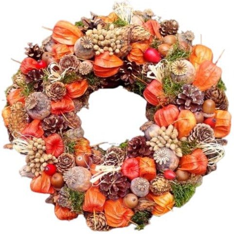 Creating an Orange Autumn Door Wreath with an assortment of natural materials like physalis, dried papaver, cones, dried natural pepperberries, and moss results in a warm and inviting decoration that captures the essence of the fall season. Embrace the beauty of the autumn season with our handcrafted wreath that radiates the warmth and charm of nature. Whether you want to adorn your front door or bring a touch of the season indoors, our natural, warm, Orange Autumn Door Wreath is the perfect choice.