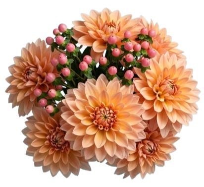 - Pink Hypericum: adding a delightful contrast, pink hypericum berries bring a touch of softness and elegance to the bouquet. Their subtle pink hue and smooth, round berries provide texture and depth, complementing the bold orange dahlias perfectly.
